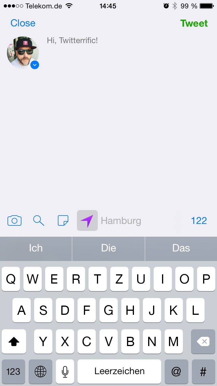 Neben 140 Zeichen an Text lassen sich auch bis zu vier Bilder in einen Tweet packen. Die eigene Location kann auf Wunsch mit hinzugefügt werden und es gibt die Autovervollständigung von User-Namen, wenn man jemanden direkt ansprechen möchten. Leider funktioniert das nicht bei Hashtags. Soll laut Entwickler aber noch kommen.